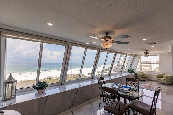 Steps from beautiful Crescent Beach, this 2 bedroom 2 full bathrooms unit is located in Gulf-side High-rise on the 8th floor. Step into the extended living lanai area to experience wrap around views of the gulf. Enjoy a window bench, choice of comfy loveseats, or dine with a view of the blue waters and white sand. An updated kitchen with stainless steel appliances peeks through to the living areas. Enter into a cozy formal dining area that flows through to the living room where you can enjoy couch seating for the whole family with a tv and views of the Gulf of Mexico. The couch also works as a sleeper sofa. The master bedroom offers a king bed, equipped with a ceiling fan and a glass sliding door allows views through the lanai of the beautiful Gulf. A double vanity master bathroom awaits with a walk-in glass door shower. The guest bedroom has a queen bed, a ceiling fan, a TV, and large windows allow a beautiful view to enjoy outside with a viewing bench. The bathroom has a walk-in glass door shower with a grab bar. There is a washer and dryer in the unit. Assigned covered parking located in the parking garage under the building. Internet access, beach access, tennis court, fitness center, sauna and access to two heated swimming pools included. No pets are permitted on the property.