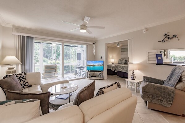 Perched on the Gulf-side of Midnight Pass, Unit 1128 offers a serene retreat. Enjoy loungers on the lanai, and take in pond views from this small garden unit. With a king-sized bed in the master bedroom and two twin beds in the guest bedroom, there's ample space for relaxation.