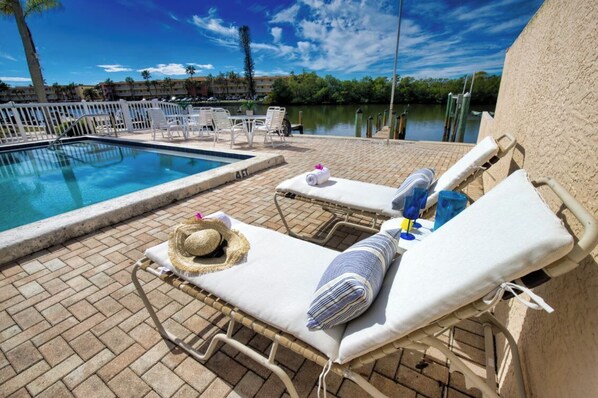 The bottom unit of a two story condominium complex. The condo has two bedrooms, 1 full bathroom, a full kitchen and a living room. The heated pool sits right behind the condo and facing the gorgeous waterfront.