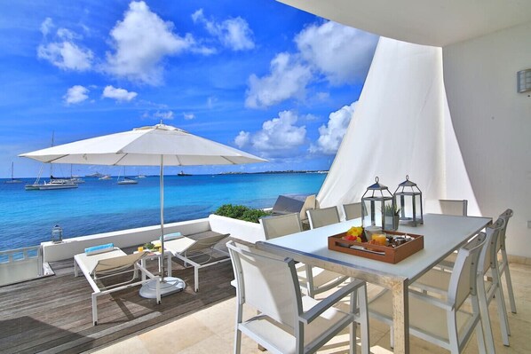 Luxury two bedroom unit at the prestigious Aqualina Beach Club directly on beautiful Simpson Bay beach. Unit 101 is the ideal property for one or two couples that love outdoor living and easy access to the beach and the turquoise Caribbean Sea. The unit is one of three in the complex of ten units with a large wood terrace just below the terrace where one will find four chaise lounge chairs, two Tucci umbrellas, a jacuzzi J-345 hot tub with built in stereo, as well as a private beach access with hand held shower. Beach lounge chairs are also provided as well as portable umbrellas, beach bags and small coolers. The interior of the unit is luxuriously appointed with everything one could imagine needing to enjoy their holiday. The unit has three large screen flat Samsung Smart wifi televisions, two ice machines, and professional Viking 500 series BBQ to name a few features.