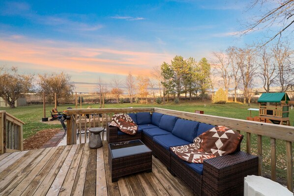 -Outdoor games (stored in red shed) - disc golf, bean bag toss, portable volleyball net, connect 4, jenga, sandbox and toys, playset and swings for kids