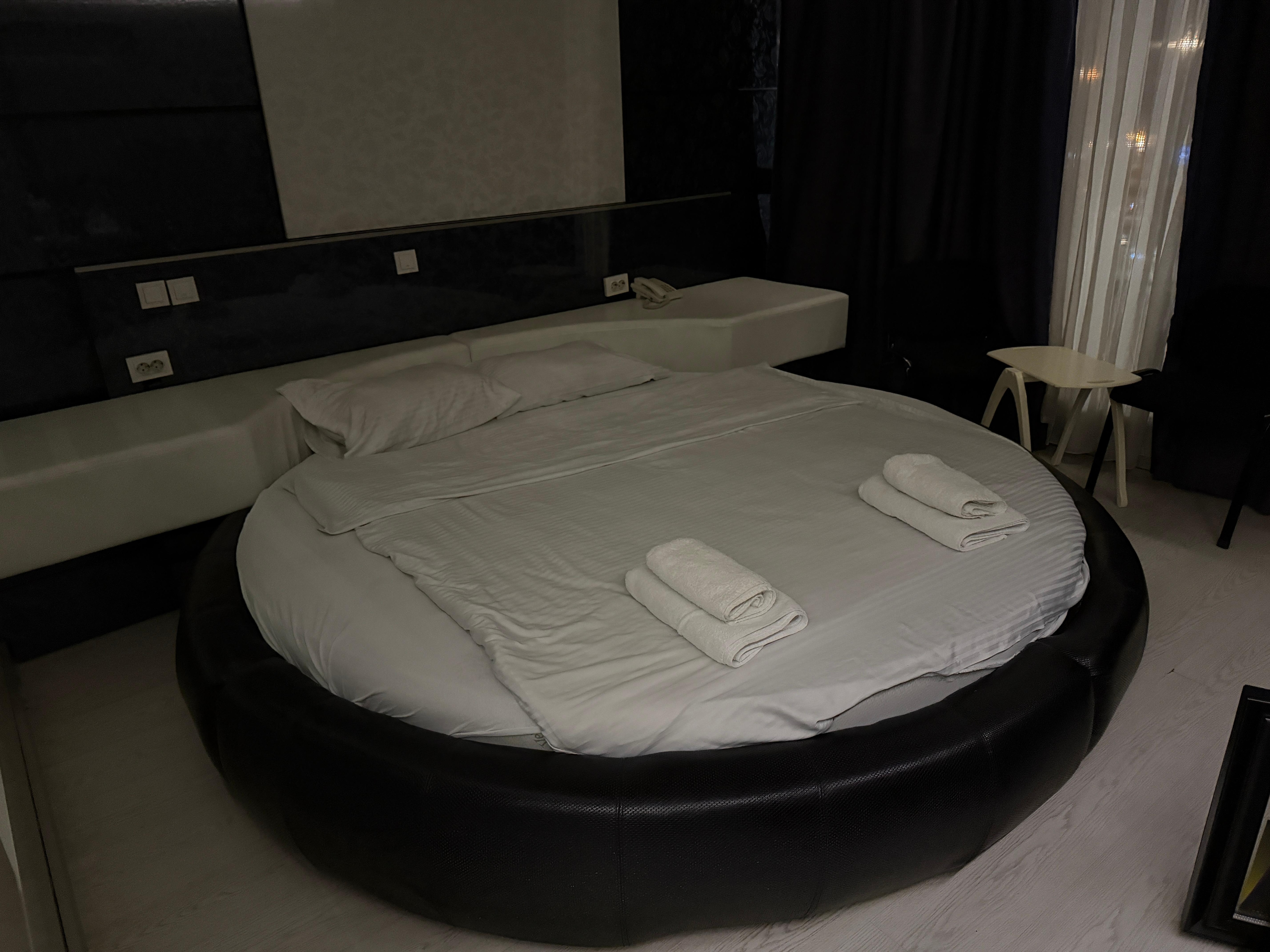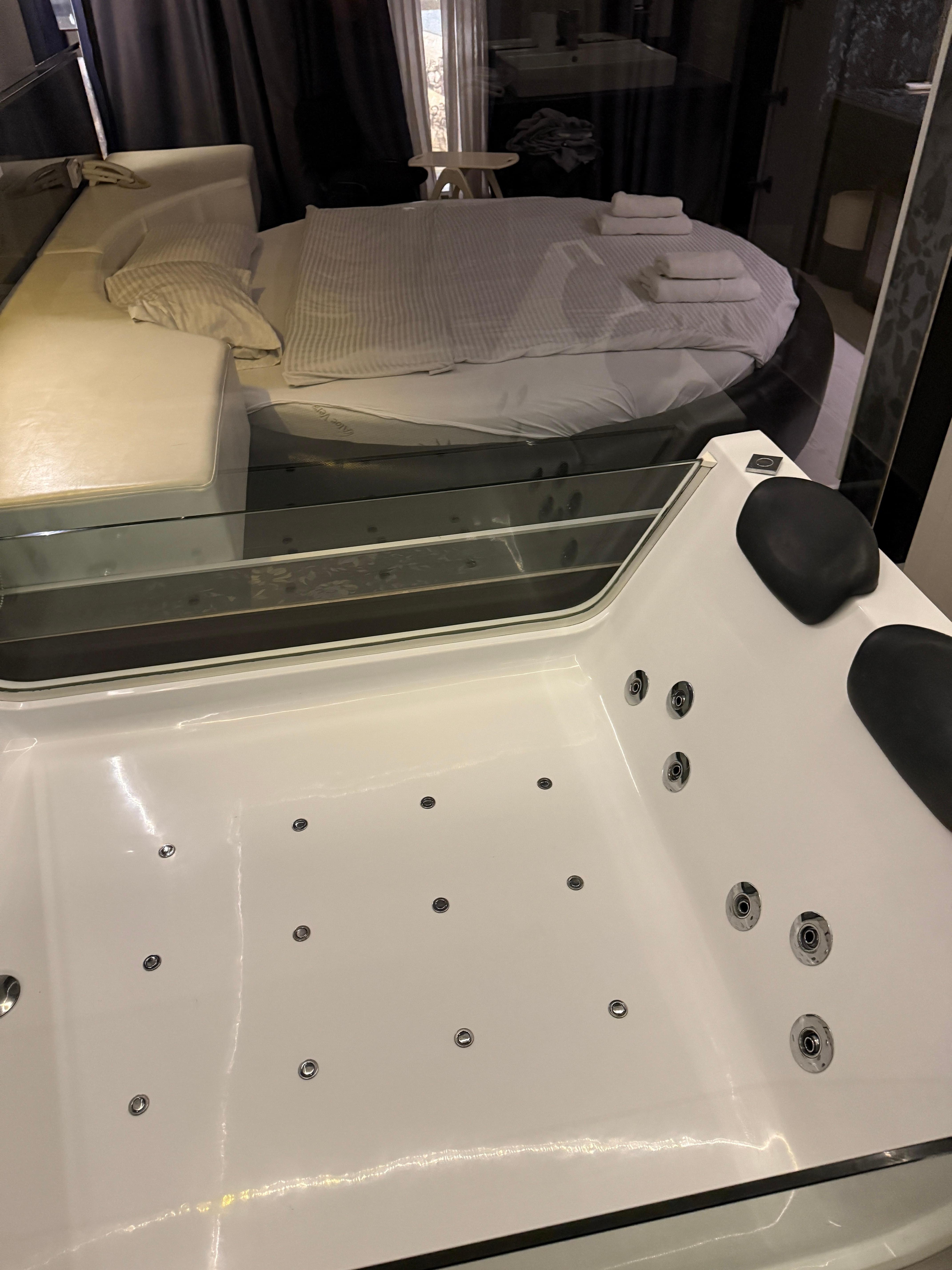 Otherwise my room ( an executive spa) was quite entertaining- round bed. Huge jacuzzi which was lovely except it leaks. When the water drains it just bubbles up from the floor drain. The shower has very low pressure and the only lights in the entire place are strands of Christmas lights so you can’t see anything. Room dirty, and in bad repair. However given the location it was a great place to be