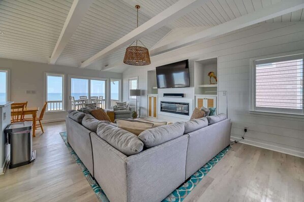 Great Room with floor to ceiling oceanfront windows. Sectional, 2 swivel side chairs, large screen Smart TV, chaise lounge, electric fireplace. Books and boardgames.