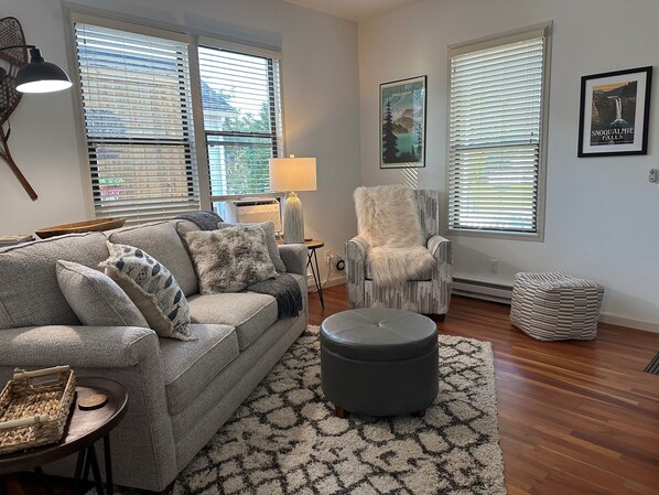 Nestled in the serene surroundings, this 1 bedroom plus den getaway is a true gem. Built in 1923, it carries a rich history that adds a touch of nostalgia to your stay. Recently updated, it strikes the perfect balance between preserving its historical allure and providing modern comforts. As you step inside, you will be greeted by a cozy and inviting atmosphere. The tastefully decorated interior creates a warm ambiance with many local touches making you feel right at home. The cozy Living room is equipped with comfy Lazy-Boy furniture with a pull-out Queen Serta sleeper & large Flat screen TV with streaming services included. The bedroom offers a Queen Serta bed with topper for extra comfort, ensuring a restful sleep after a day of exploration. The den is equipped with a Full pull-out Serta bed & perfect flex space with TV & gaming. Outside you will find yourself surrounded by the breathtaking beauty of the valley, Mt Si stands majestically in the distance, inviting you to embark on unforgettable hiking adventures. Enjoy the deck with hot tub, cushy outdoor patio furniture & propane fire pit! Detached garage is perfect for your toys. Bring your skis, snowboards, kayaks, ATVs and have peace of mind of secured storage. Also equipped with extra fridge & freezer, perfect for hunters.