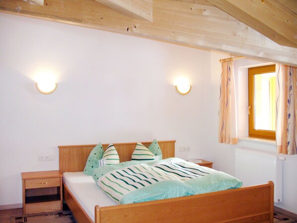 "Birkenheim", 3-room apartment 58 m2 on 2nd floor. Practical and beautiful furnishings: 1 room with 1 bed and 1 double bed. Exit to the balcony. 1 room with sloping ceilings with 1 double bed and bath/WC. Kitchen-/living room (4 hot plates, oven, dishwasher, kettle, microwave, electric coffee machine) with dining table, satellite TV. Exit to the balcony. Shower/WC. Oil heating. Balcony. Facilities: children's high chair, baby cot for up to 2 year olds (extra). Internet (WiFi, free).