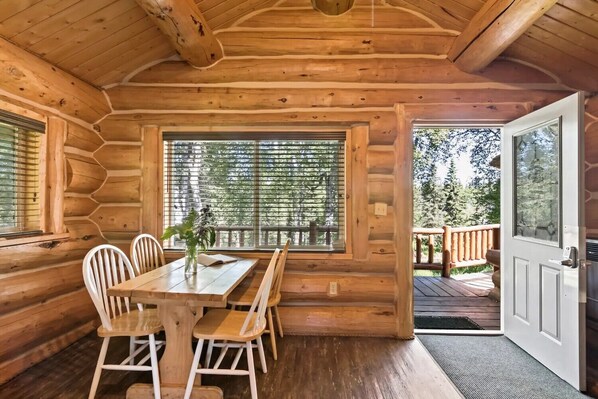 Located mere steps from the Kenai River banks, Sockeye Salmon or cabin #4 is a relaxing 1BR (plus bonus sleeping area) basecamp with convenient access to Alaskan adventures. Start your vacation days with morning coffee on your private river-facing deck. Whip up snacks in the well-appointed kitchenette and unwind. Designed with local spruce logs, this cabin has true Alaskan charm. The Kenai Kuik Cabins community boasts 110’ of private riverfront property! Beginners and avid anglers alike will love casting lines from the fishing dock. Steps provide easy river access. Grill to perfection on the charcoal grills under the covered picnic area and enjoy a nice bonfire with plenty of wood for smore’ gatherings. Shared washers and dryers are available free of charge in a communal area. After a fun-filled day, sip refreshing drinks on the deck which offers peekaboo river views through the woods. This rental is one of five adjacent cabins in the Kenai Kuik Cabins community. If traveling with a larger group, consider renting one of the next-door units. Appliances in the convenient kitchenette include a gas range/oven combination, a microwave, refrigerator, coffee maker and a sink. This one-story cabin accommodates up to six guests in two twin-over-full bunk beds. The bathroom has a tub/shower. Prepare to unplug and relax fully; this delightful riverside getaway does not have TVs, or air-conditioning. The private river-facing deck invites you to kick back and enjoy the gorgeous scenery.