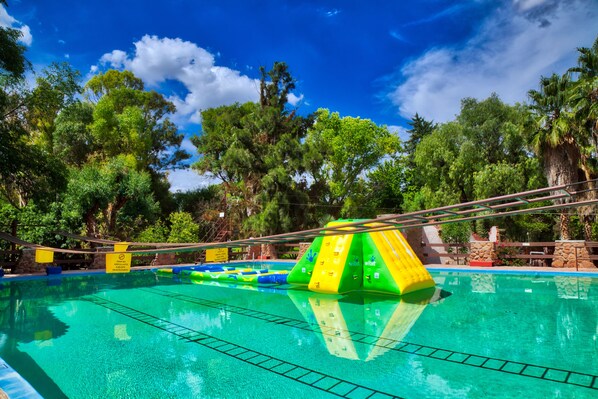 Our attracticons include karting track, canopies, kayaks, all terrain bike circuit, 4 swimming pools with water slides, old western style town, train station, high rope courses, big air bag jump, zip line, sport fields, horse back riding, climbing walls, giant play room, mini golf, and much more.