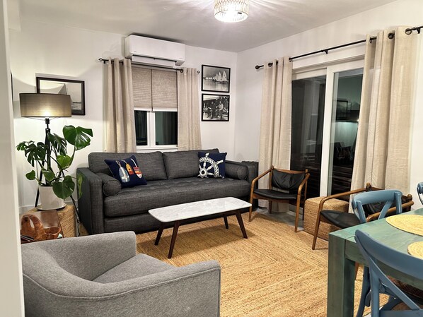 Interior for lower level cottage is completely updated and newly furnished, white walls, high ceilings, flooded with light and ocean breezes. Open concept living, kitchen and eating inside with 2 large sliders to outside dining and seating.