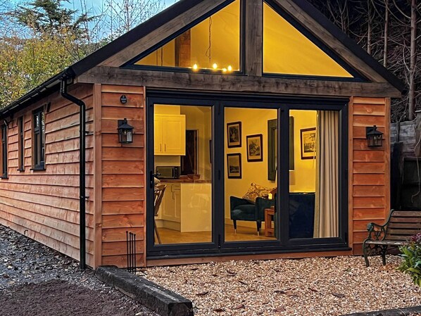 The spacious sitting and dining area forms the heart of the lodge, with bifold doors opening to the outside and framing views across the adjoining paddocks. The overall feel is airy and refined, with electric central heating ensuring year-round comfort. Outside, a small gravelled seating area with table and chairs offers a pleasant spot to enjoy a morning coffee or evening drink while taking in the rural surroundings.