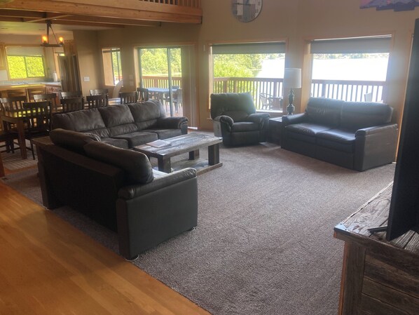 Guests will love the views! Enjoy your morning coffee on the covered deck or have a drink on the covered patio, steps away from the second kitchen bar. There are two large family rooms, a dining room, kids hang out with twin beds and a beautiful open loft. Pets are welcome with pet fee ($200 for up to two pets). Two kayaks, life jackets, pedal boat and a standing paddle board are all included. Flat yard, great for lawn games. Propane BBQ and gas fire tables included for guests to enjoy. These are great to sit around and hang out together, or roast up some marshmallows! Feel free to message us any questions. Thank you for considering our lake home for your next vacation!