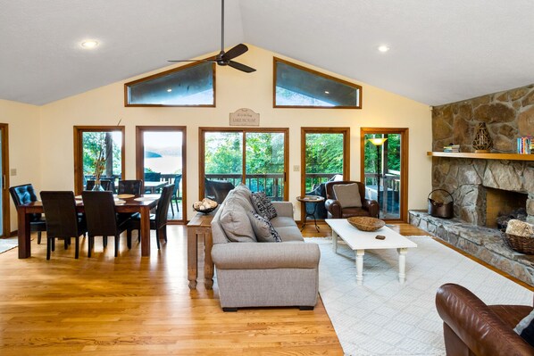 Looking for a place to relax and unwind? Looking for a place to boat, ski, and swim? The Haven is the perfect place for one or multiple families to come and enjoy the beauty of the outdoors! The home is nestled on 3 wooded acres on the end of a cul de sac so it is very private. You can sit out on the covered deck or patio and enjoy the beautiful year round lake view or relax by the fire at the fire pit that overlooks the lake or in the large hot tub. There is plenty of nature for the children to explore and safe areas for the children to run and play outside.