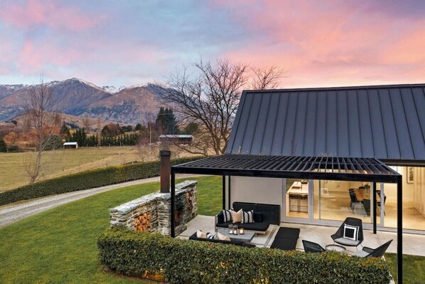 If al fresco is more your style; open the doors and step out into the adjacent outdoor entertaining space, with cosy fireside lounge seating, along with all the ambience of the peaceful surrounds has never looked so good. Imagine yourself here, glass of Central Otago Rose in hand! This area features a large schist fireplace, covered louvre system and Weber BBQ.