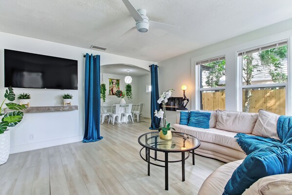 In the heart of St. Augustine, this 3-bedroom house offers a haven for relaxation. With its soothing living room ambiance and cozy futon, guests can unwind in style while enjoying convenient amenities like AC, WiFi, and a washing machine.