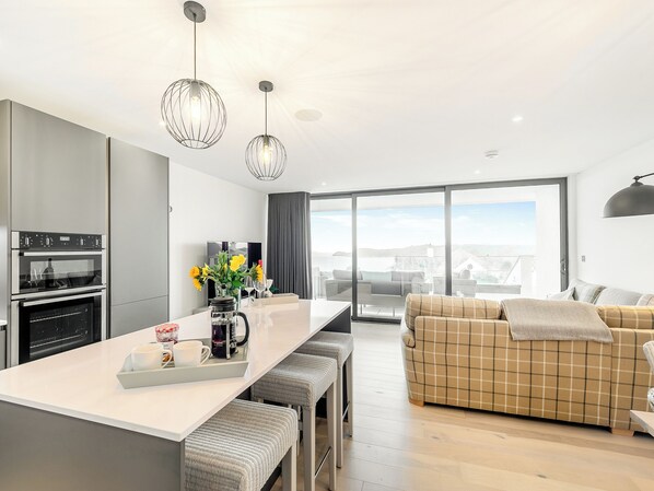 You’ll walk into an impressive open plan space, comprising of a beautiful dining area with wooden table and attractive rattan chairs seating six, a living area with Smart TV and sumptuous corner style sofa facing out towards an incredible outdoor terrace, which opens fully to bring the outdoors to you, the sea glistens beyond as part of this mesmerising spectacle. The kitchen has everything you could need, from Cafetière to Quooker hot tap.