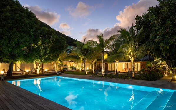 In the heart of Saint-Barths, Villa Manoir De Lorient is a luxurious haven that welcomes you to its tropical paradise. This 18th-century French manor offers an unforgettable stay with its vast living room, professional kitchen, and indoor or outdoor dining areas. With a large mirror pool and sumptuous swimming pool surrounded by palm trees and green grassy areas, this villa is ideal for families or friends sharing the St-Barths experience.