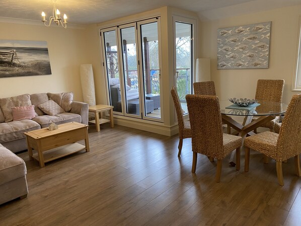 The upper story has the living, dining area, and kitchen. The lounge also has the advantage of looking out over the Marina and the River Ouse. A spacious balcony with outdoor seating is accessible through bifold doors. Why not enjoy a bottle of wine while unwinding or feeding the fish or ducks while taking in the sunshine. An oak and glass table and chairs are in the living room together with a sizable corner sofa. On the wall is an LED smart TV with a Virgin Media connection providing TV and catch-up services on demand.