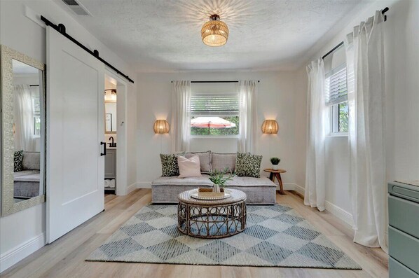 To ensure your comfort, our home is outfitted with luxury mattresses, quality linens, and great pillows, all cleaned to the highest standards. Our primary bedroom has a queen size bed, dresser and plenty of space for storage as well as a smart TV for you. Additionally, this large space has a separate seating/sleeping area for relaxing, reading a book or watching TV. The bedroom leads into the en suite bathroom with a vanity and stand up shower. All towels and amenities are selected with you in mind.