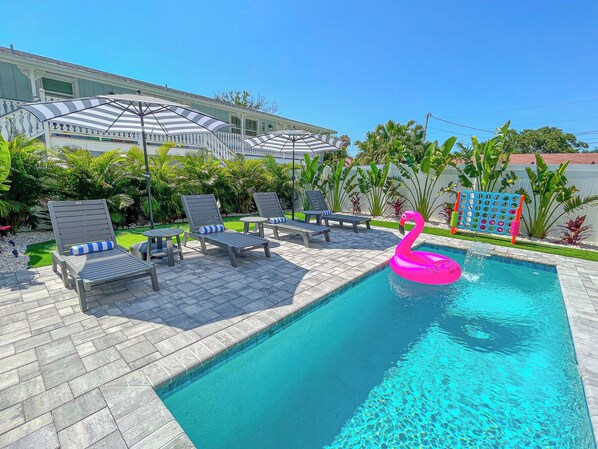 Take a dip in the heated pool and play connect four surrounded by lush tropical landscaping.