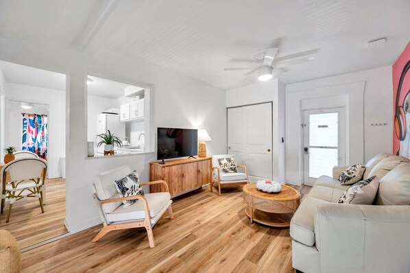 The Aloha Suite features a generously sized kitchen equipped with quartz countertops and a four-burner stove/oven. Prepare meals with ease and convenience, embracing the culinary delights of your tropical escape. Relax and unwind in the primary bedroom with a king sized bed. Enjoy a restful night`s sleep and wake up refreshed, ready to embrace the day`s adventures. With direct access to the bathroom, convenience is at your fingertips. The living room boasts a comfortable queen-size sleep sofa, providing additional sleeping arrangements. Lounge in style and comfort while enjoying extra seating and a large TV for entertainment during your stay. Refresh and rejuvenate in the full bathroom, complete with a convenient walk-in shower. Accessible through the main living area, this bathroom ensures convenience and comfort for all guests. The suite comes complete with a full linen set, beach and bath towels, essential amenities, and complimentary WiFi.