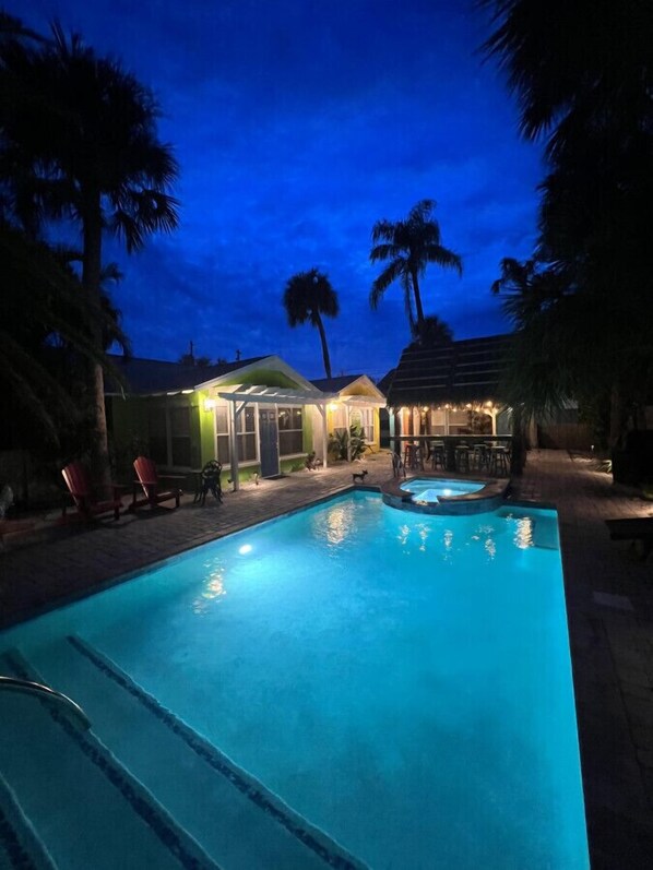 The heated saltwater pool, jacuzzi, and 2 outdoor tiki bar/grills in the fenced back yard compound (5000 sq. ft.) are shared between the 4 cottages.
