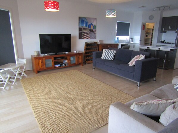 Dining area with dining table/chairs, lounge area with large 50" TV, DVD, 3 seater plus 2 seater lounges, small kids table and chairs, 2 large bean bags.