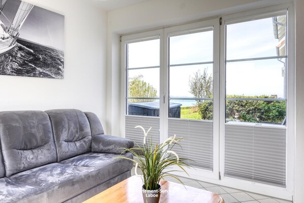 2 1/2 room apartment up to 6 people 55m², combined living room / bedroom with comfortable seating (double sofa bed), fully equipped kitchen with dining area, double fold-away bed, satellite TV, stereo, telephone and WiFi, bedroom with double bed, small hallway with cloakroom, shower / WC, furnished large terrace, very nice view of the Baltic Sea, parking space