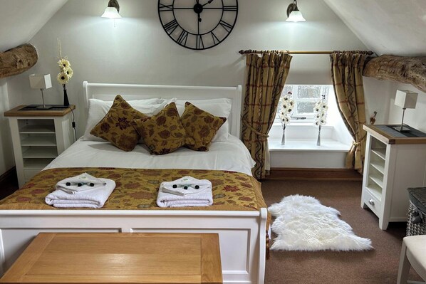 Centrally heated throughout, the farmhouse features a welcoming living area with leather sofas, a gas log burner, 55” TV, and unlimited WiFi. There’s a dining space for six and a fully equipped kitchen with solid oak units, range cooker, and a Nespresso Vertuo machine.
