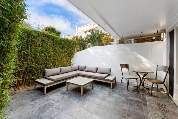 This cozy studio offers a long, comfortable layout with a welcoming living space and Smart TV for lounging. A small bathroom, convenient kitchenette, and in-unit laundry make longer stays easy, while the outdoor patio is perfect for morning coffee or evening relaxation. Ideal for couples seeking a quiet coastal escape.