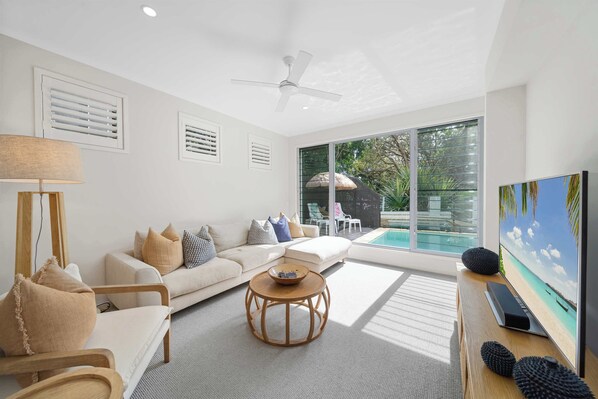 The fully equipped kitchen makes dining in effortless, featuring a gas stove, oven, fridge, freezer, dishwasher, microwave, and toaster, along with essentials like tea, coffee, and basic condiments. Gather around the eight-seater dining table indoors or enjoy a meal outside on the spacious back verandah, covered for year-round entertaining. Step beyond to the verandah, where a saltwater pool is framed by lush greenery and a built-in alcove lounge — a private, sun-drenched oasis perfect for lazy afternoons or a cooling dip. After a day at the beach, rinse off under the outdoor shower before settling in for a relaxing evening.