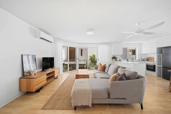 Step inside this light filled apartment and settle into a simple, comfortable layout designed for easy holiday living. The open plan living and dining area includes seating for four, a smart TV, and air conditioning to keep things comfortable year round. Sliding doors open onto a private balcony with an outdoor sofa, creating a relaxed spot for morning coffee or evening wind down time.