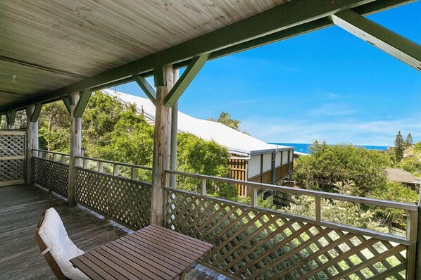 This older style timber home sleeps up to 4 guests across 2 bedrooms. While there is no air-conditioning or pool it offers ocean views from the deck outside the main bedroom. Open up the sliding doors that surround the house and let the ocean breezes do their job. Relax on the spacious front deck after a hard day on the beach with a pre-dinner drink.