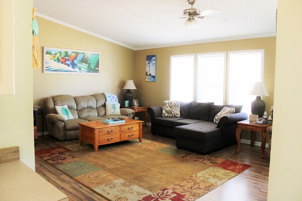 Beach House offers a tranquil retreat just a short drive from the beach. Enjoy quiet evenings after a long day of sun and surf, unwind in the spacious master bedroom with king-size bed or gather on the expansive 12x16 deck for family grilling nights.