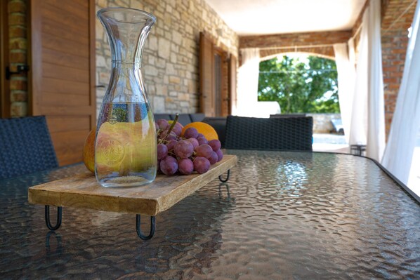 Wir waren zu viert für 2 Wochen in diesem Haus. Das Haus , der Außenbereich mit Garten und Pool sowie Terrasse war sehr ansprechend. Es waren genug Liegen vor Ort und 2 Autos konnten mühelos parken. Das Wohnzimmer und Küche geräumig, die Ausstattung und Böden sehr geschmackvoll gestaltet. Es gibt 2 Bäder aber eines davon hat nur eine Badewanne anstatt Dusche. Hier muss man sich hinsetzen um zu duschen, weil auch der Duschschlauch nicht lang genug ist und es hierfür auch keine Duschvorrichtung gibt. Der Wasserdruck ist gering demnach konnte man nicht gleichzeitig in beiden Bädern duschen. MIt 8 Personen wäre das unvorstellbar. In der Küche gab es zu unserer Zeit kein warmes Wasser. Die Betten waren uns zu klein demnach konnten wir 4 jedes Schlafzimmer einzeln benutzen. In der Küche gibt es einen kleinen Unterbaukühlschrank und einen großen Typ amerikanischen Kühlschrank incl. Eisbach. Leider ist dieser in die Jahre gekommen, dreckig vor allem die Außengriffe, diese sollte dringend ausgetauscht werden. Es gib eine kleine Geschirrspülmaschine die gerade das Geschirr von 4 Personen packt. Mit Steckdosen wurde hier auch gespart (unbedingt 3er Stecker mitbringen). Die Gegend ist sehr ruhig, das haben wir genossen, es war Anfang September und wir hatten so gut wie keine Nachbarn. Das Haus liegt in einer Feriensiedlung. Der nächste Supermarkt "Plodine" ist ca 10 min Autofahrt entfernt. Möchte man zu Kaufland oder Lidl fährt man am besten zu Pula, das sind ca. 20 min Autofahrt.