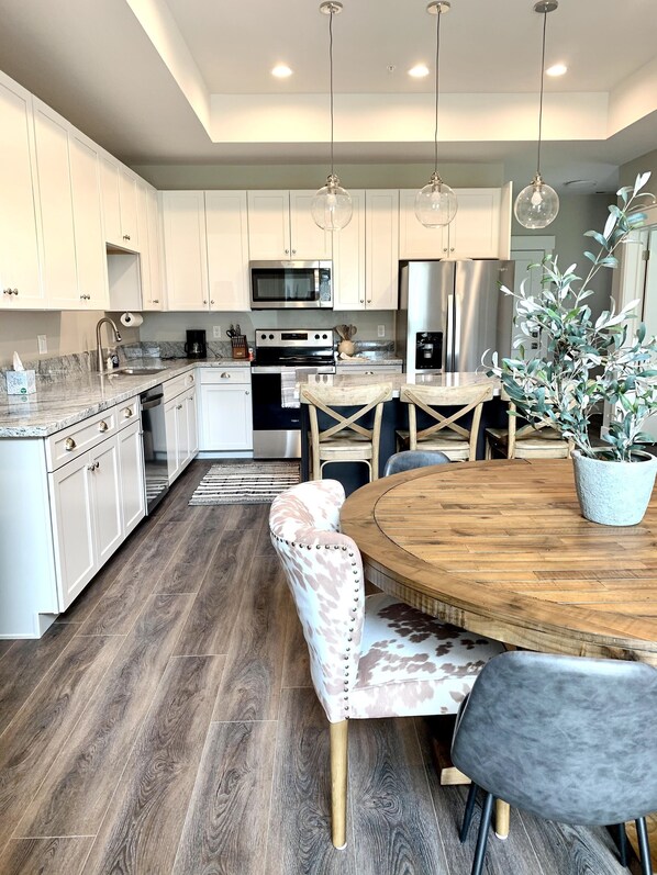 This 1,800 square foot townhome accommodates a large and well stocked kitchen, laundry room with a sink, 4 bedrooms, 2.5 bathrooms, and a living and dining room to gather for games and socializing . Two bedrooms are located upstairs with a full bathroom to share while the master and bunk room are found on the main level.