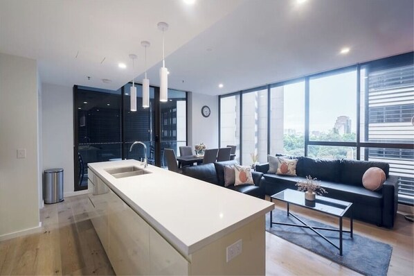 Welcome to this exquisite apartment boasting luxury and sophistication, featuring high-end finishes and captivating views of Hyde Park. Designed for comfort and style, this accommodation is ideal for families or groups of friends traveling together, offering a seamless Sydney escape.