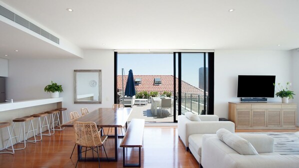 Situated in an upmarket and secure apartment block, you'll ascend to this sumptuous penthouse. The epitome of modern living, the apartment unfolds to reveal a calming minimal interior. An open-plan living space encloses a full kitchen with a sleek breakfast bar, overlooking a formal dining table, giving you plenty of options whether you're having a casual brunch or a celebratory dinner. The room continues into a soft seating area, which is harmoniously connected to the local scenery via floor-to-ceiling windows, framing your stunning ocean views. What's more, you can push back these windows and extend alfresco to both of your private balconies, complete with additional seating. This spot is known for whale watching, and blessed with a nearly 360-degree view, you'll have the best chance of achieving this once-in-a-lifetime sight!
