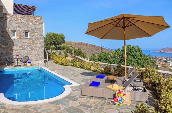 A luxury Villa with a Pool to enjoy hospitality offering breathtaking views of the sea and the endless blue. Suitable for couples or groups of friends seeking the ultimate relaxation and tranquility for an ultimate holiday experience in a modern setting.