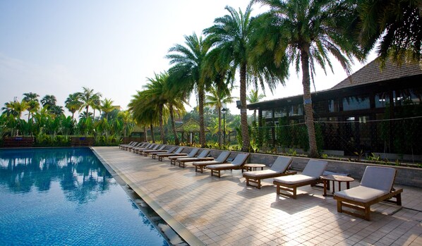 Travelers can lounge by an outdoor pool nestled in gardens or sample local flavors at five distinct restaurants at this Tainan retreat