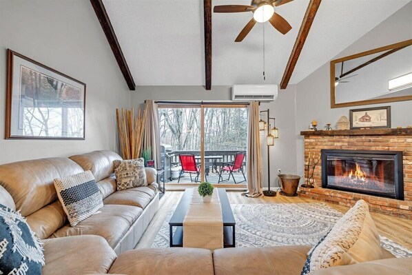 The living room has a leather sectional Sofa and 60" smart tv with roku so you can stream your movie.A X-Box 360 is also provided. A blu-tooth sound bar is also provided for music. Get cozy by sitting next to the wood burning fireplace during the cold winter months.