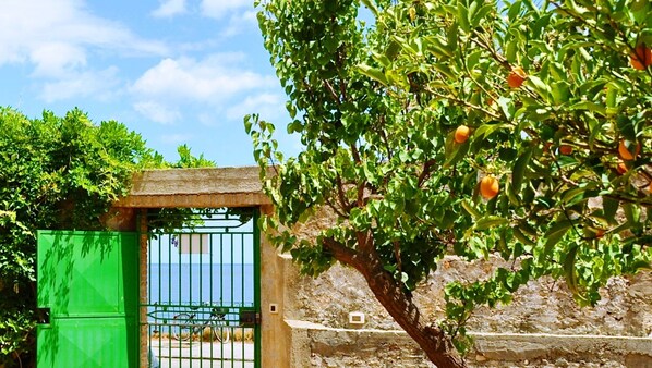 Located right in front of the largest and most beautiful beaches of Taormina, the apartment is surrounded by a large Sicilian garden. The garden with citrus trees, olive trees, exotic plants and wisteria pergola is furnished with table and chairs, loungers and outdoor shower, and is surrounded by an ancient wall covered with bougainvillea and closed by a gate, within which is located its own private parking. The apartment (located on the ground floor of a one a floor villa) is located on the waterfront close to beach establishments, bars, restaurants, pizzerias, and all kinds of shops, and is 300 mt. from the bus stop, 10 minutes far from the historical center of Taormina, located on a hill. Coming out of the gate of the garden there are both a large public beach and different beach establishments. The sand here is medium to thin, with some small pebbles near the shore and the water is incredibly clear. The garden house, with its privileged location on the beach and the privacy of its flourishing fenced garden, is the ideal place to relax oneself and enjoy the sea and the walks around the magnificent views of Taormina, to make boat trips and to practice water sports. But it is also in a point very easy to reach, and convenient for excursions: it’s less than a kilometer from the highway exit of Taormina, 60 km from Catania airport, 45 km from Messina harbor and 6 km from Taormina-Giardini Naxos train station. It has a strategic position for excursions to all the Eastern Sicily (and so for Etna and its park, the Aeolian Islands, Syracuse, the Alcantara Valley, with its gorges and waterfalls, the Agrò Valley with its medieval towns, Norman castles, Byzantine churches, etc.).