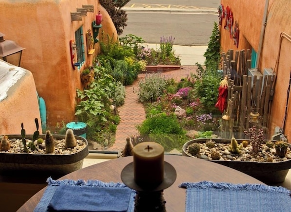 Red Cat House is located on Dona Luz Lane, 'The Garden Street of Taos' (landscaped by me, a professional landscaper) This street boasts a wonderful variety of shops and restaurants. It was once the 'Red Light District' in town and La Dona Luz was a madame. Entry is down a little brick pathway surrounded by blooming plants with original outdoor art on all walls and an outdoor seating area. Upstairs is Red Cat House-a wonderful intimate world of its own. You will discover antiques, color and light, original art and whimsical touches in your own private little world. The sunny eat in kitchen is well equipped for morning coffee, a gourmet breakfast or a romantic dinner for two. The living room is a perfect spot for lounging with a comfortable couch, lamps, a flat screen TV, DVD's, books and a selection of music for just that right mood. Enjoy dinner at an 18th century walnut tilt top table for two looking out over the Plaza with a view of Taos Mountain in the distance. If you need to do a little work (not too much I hope), there is high speed internet available and a desk where you can write about your wonderful Taos adventures or even compose a spontaneous love poem if so inclined. Many of my guests enjoy my record player and collection of albums. The sunlight bathroom has a large shower, lots of towels, robes for two and some fun touches to discover. The bedroom is so very special with an antique queen size, pillow top, four post teak canopy bed, down comforter, fine linens and lots of pillows. I even have an electric mattress pad for chilly Taos nights. So nice to climb into a warm bed.Hang your clothes in a tall mirrored English oak armoire. The bedroom is cozy with a gas log stove. The multi paned windows are screened to allow you to enjoy our wonderful mountain air that just invites snuggling-so cozy and romantic. Summer visitors will enjoy window air conditioners in bedroom, kitchen and living room. There are also ceiling fans in living room and bedroom. If you can tear yourselves away from the comforts of Red Cat House, all of Taos is just outside your door. You are within easy walking distance of all Historic District shops, restaurants, galleries and museums. Ask me where to go for live music and special events during your stay so you can meet folks who enjoy life and all the richness Taos has to offer. I enjoy sharing the charms and stories of our town with visitors. Although this apartment is right downtown evenings are quiet; an advantage of these old Taos buildings with thick adobe walls. Red Cat House has so much to offer. This is a little slice of Paradise in Taos-the perfect vacation spot you will always remember. p.s. No significant other at the moment? Red Cat House is a perfect solo vacation spot too. As with all of my properties I am dog friendly. $10 per night per dog. You may leave on dining table upon departure or added to booking fee. I provide dog sheets for sofa and bed. Please use. I offer a generous 50% discount for stays over 30 days as well as a $100 per stay per pet fee. PLEASE NOTE: Even if my calendar shows a reservation for your dates take a look at Vrbo 513557 or Vrbo 598600. Both are similar apartments on the same street..Although the town has begun to charge for downtown parking the church lot on the corner is only $5 per day. Town lots are free after 6 and Sunday.