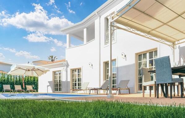 Treat yourself to a comfortable stay in this beautiful white stone vacation home. On two floors, you can discover the high value and quality of the house, which is furnished with a fantastic eye for design and coziness. Impressive furniture and lamps create an incomparable feel-good atmosphere that promotes togetherness and also promises you privacy, as all bedrooms are equipped with their own bathroom. Relaxation is not neglected here, as you can also relax in the sun on the two terraces or get together for a dip in the pool.