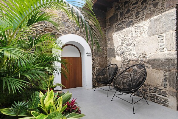 Finca La Suerte Grande is a 35,000-square-meter agricultural estate located in Telde, featuring a wide variety of fruit trees. It's rare to find so much nature in the heart of the city; this place was restored and opened to the public in 2022. The estate offers 7 vacation homes situated in different areas of the property. Please note, this is not a hotel. The Dalia apartment is part of La Casona, which also includes Musa, Lis, Iris, and Cala. Dalia accommodates 2 guests and features a living room with kitchen, bathroom, double bed, armchair, and a private terrace. Dalia shares facilities with 5 other apartments; the pool, pergola, washing machine, and dryer are all communal. Free parking is available.