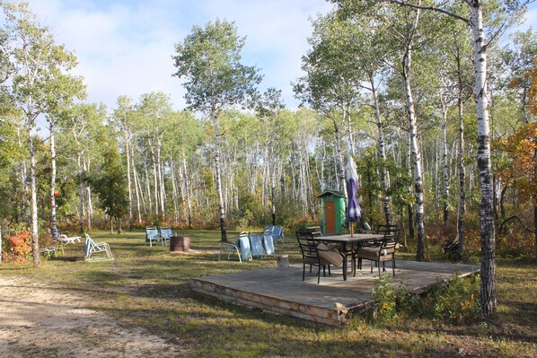 Though the rental cabins have their own lawn chairs, tables and firepits, there is a common area where we provide outdoor games, large fire-pit and seating areas.