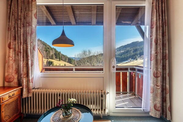 Enjoy the private balcony with views over the valley and surrounding mountains. In the rural setting, you'll find a small farm with horses, chickens, and cats. With a bit of luck, you might even spot cows through the kitchen window in the morning.