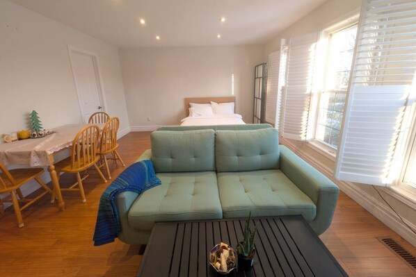 The suite was okay, but there are a few things future guests should know. It's located at the far northern edge of the city, so you’ll definitely need a car to get around. It’s above a garage, and the garage door motor is loud enough to vibrate the bed—though thankfully it wasn’t used at night during my stay.