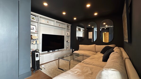 Spacious living room with large sectional and smart TV