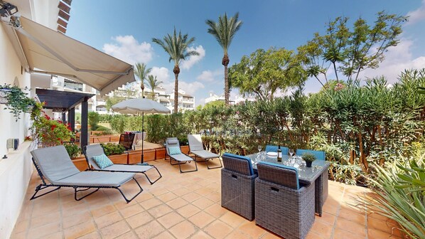Ground floor apartment with large terrace leading out to communal pool and close to town centre and clubhouse. Ample parking on street plus access to a dedicated space in garage below. The apartment is presented to a high standard and has been extended to include a second full size en suite to the master bedroom. An additional 1 or 2 guests can be accommodated on the large sofa bed. Glass curtains to the inner terrace gives year round enjoyment.