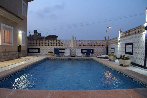 The villa is great for large families with four spacious bedrooms and 3 large bathrooms. There are two double bedrooms and two single bedrooms being great for families. The master bedroom has a private balcony to enjoy the evening and overlooks the private pool. The living room area is very spacious with two sofa's and a flat screen television with full UK TV package plus FREE WIFI. A separate large dining room will seat eight easily. Also a fully fitted kitchen to prepare whatever feast you wish! Outside the villa has a massive area for sunbathing, hosting parties or for the kids to play. A lovely terrace with canopy to relax on or BBQ by the private pool. The pool is larger than with most villas with plenty of room for all.