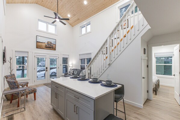 Blue Chair Hideaway, a serene retreat adorned with soothing blues and grays, offers three convenient TVs and an en suite bathroom for added comfort. Gather around the community firepit under starry skies or enjoy outdoor dining on the spacious screened-in deck overlooking the lake.